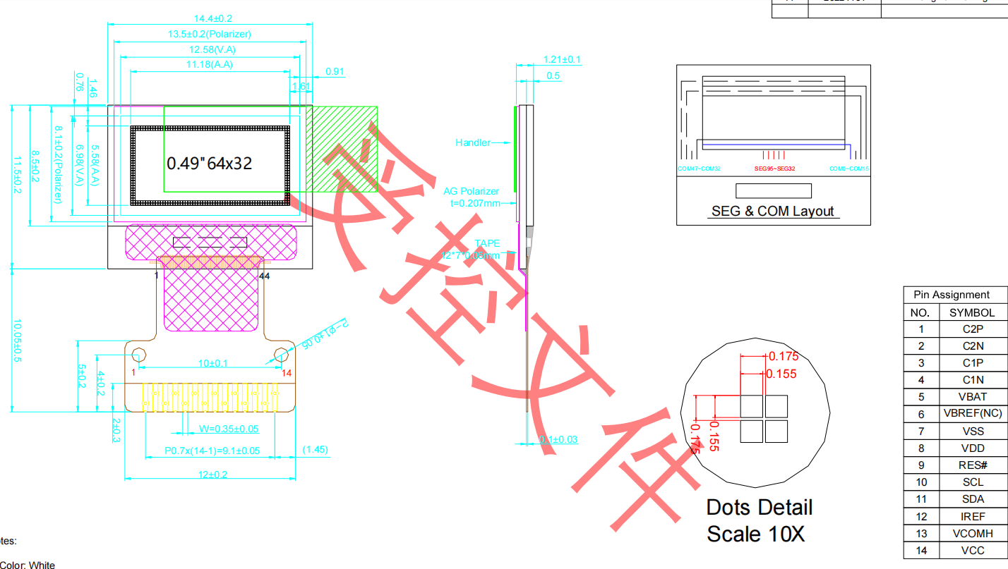 0.49 inch oled display panel 64x32 pixels white color 14 pin connector type oled screen 15mm length FPC oled panel