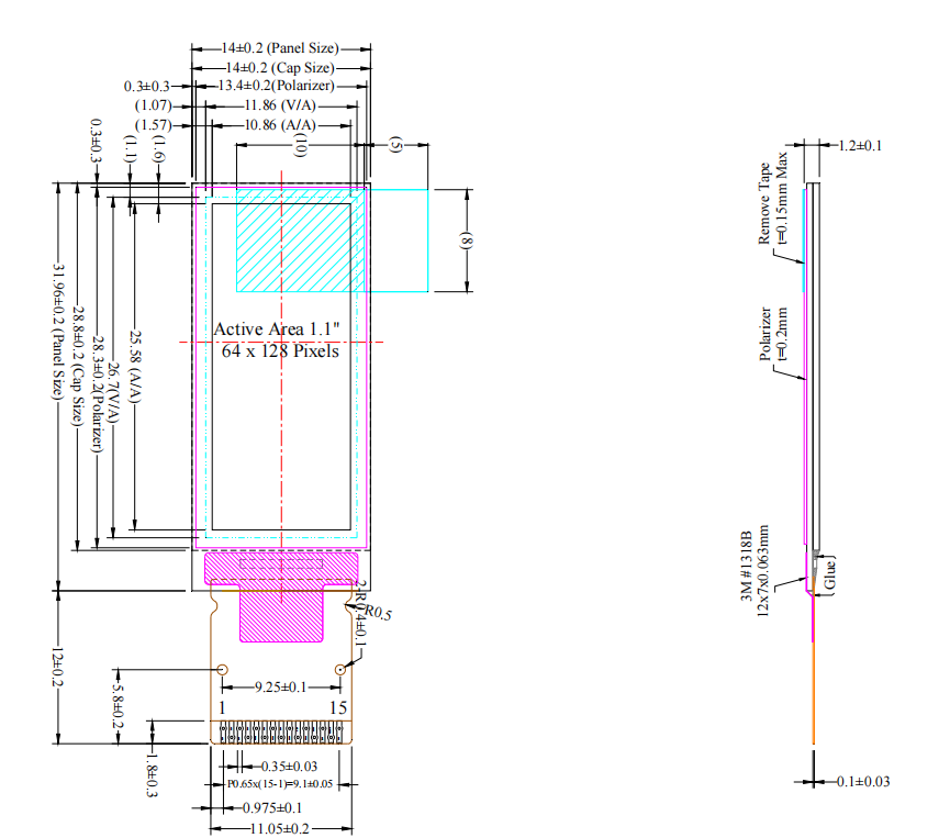 4) Active Area: 10.86 x 25.58 (mm)