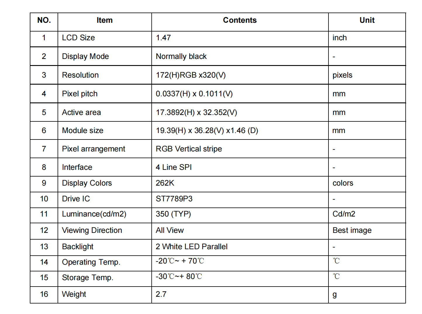 3 Resolution 172(H)RGB x320(V) pixels