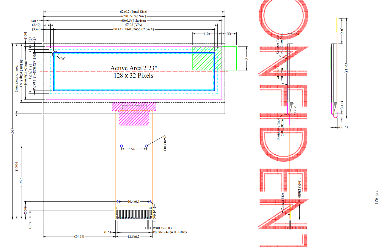 3) Panel Size : 62.00 × 24.00 × 2.00 (mm) including “Anti-Glare Polarizer”