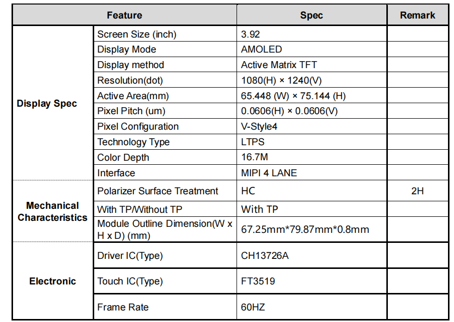 3.92inch AM OLED Display Panel ONCELL Touch Panel 1080x1240 CH13726A MIPI Interface Full Color Am Oled Display