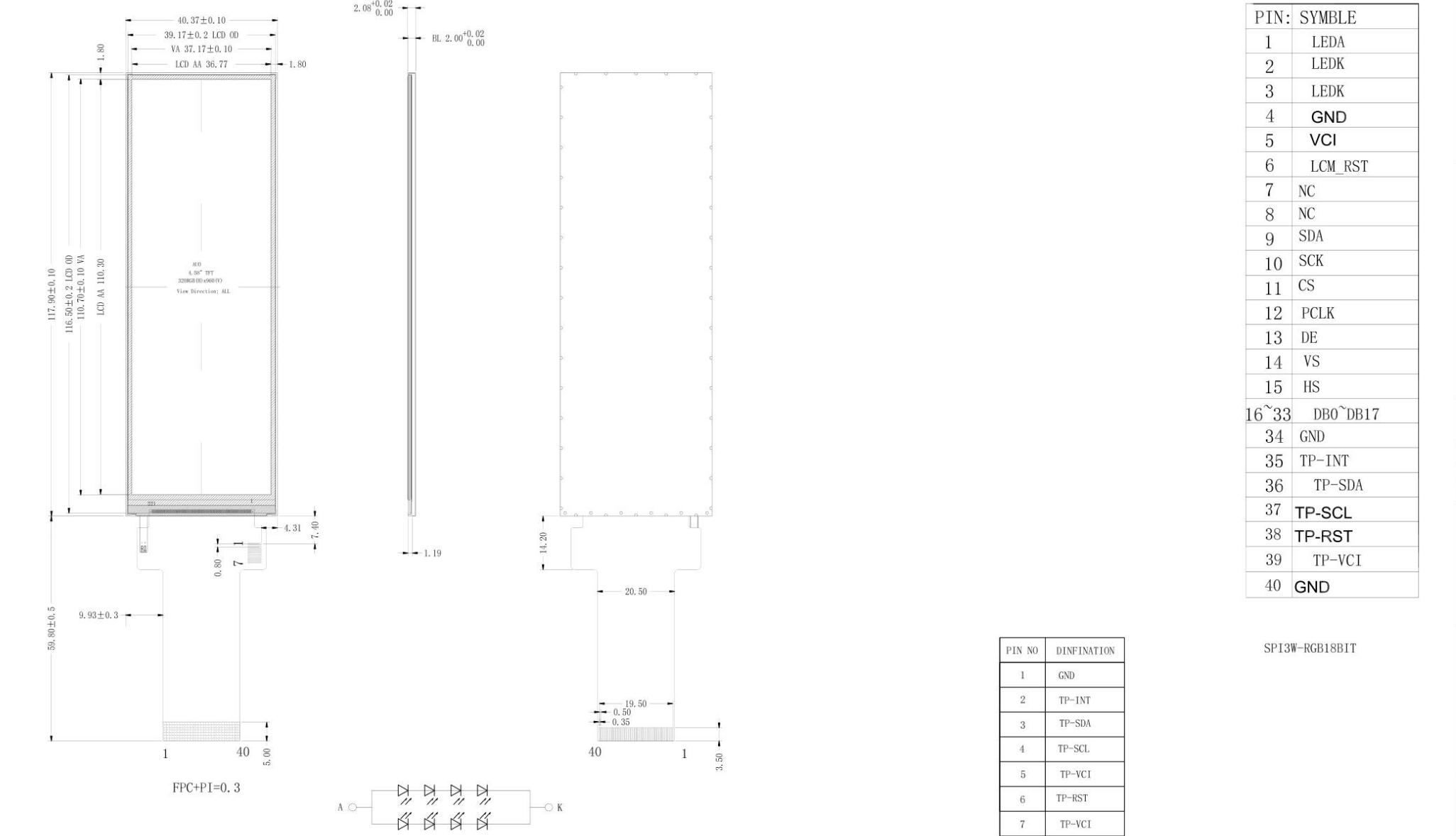 LCM outline size:40.37 (H) x 117.90 (V)mm