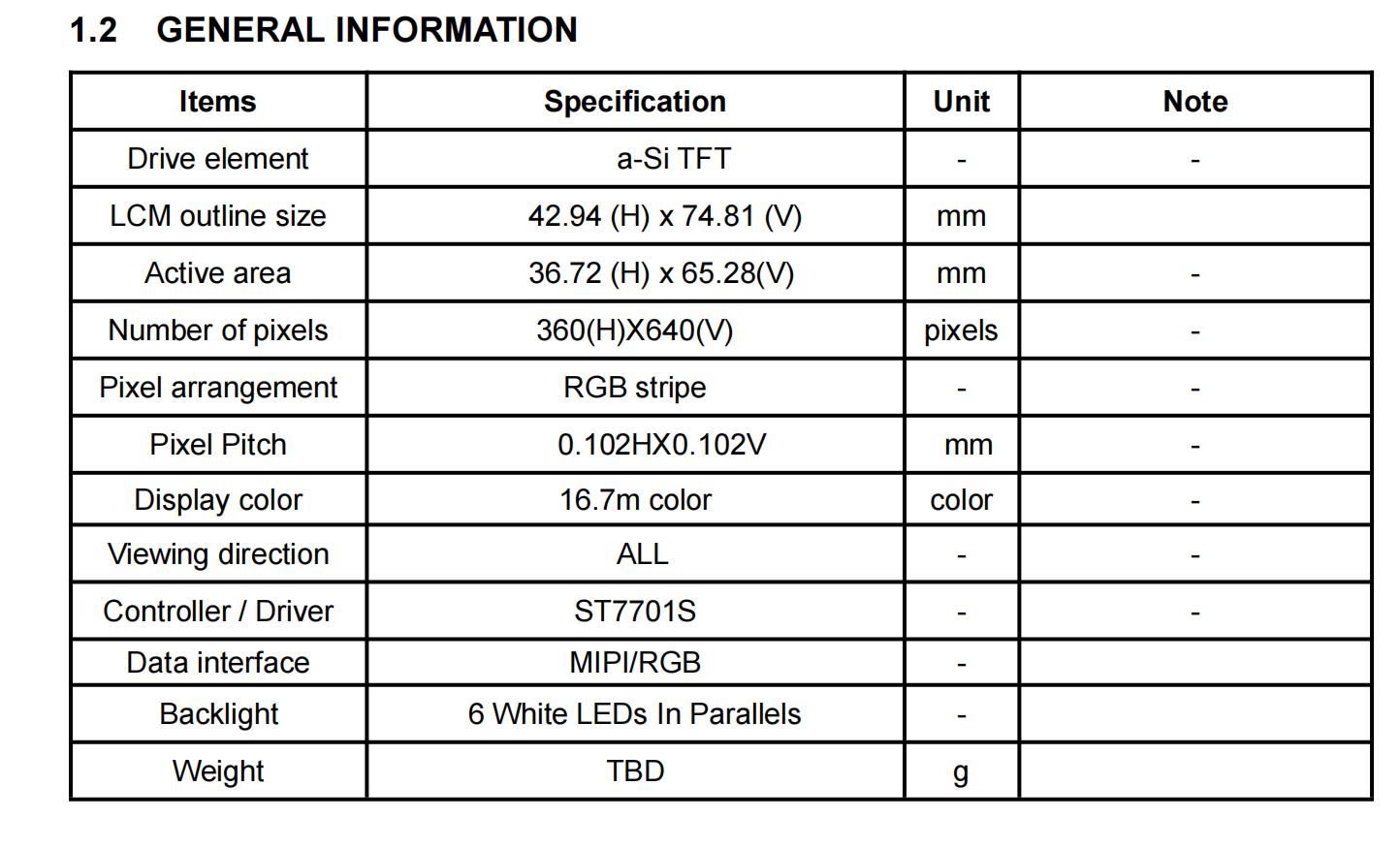 أبعاد وحدة شاشة العرض (LCM): 42.94 مم (أفقي) × 74.81 مم (عمودي)