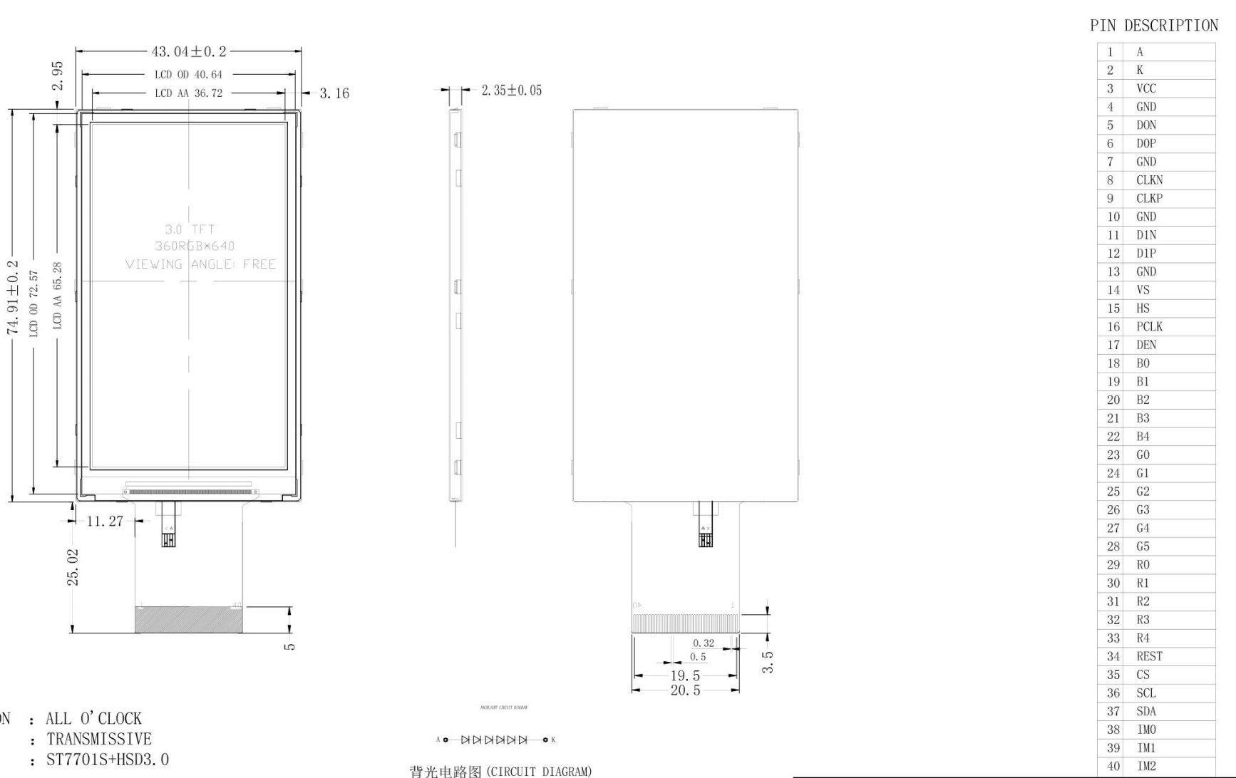 شاشة عرض LCD TFT بحجم 3 بوصات ودقة 360×640 بكسل، ملونة بالكامل، واجهة MIPI/RGB، رقاقة التحكم المتكاملة ST7701