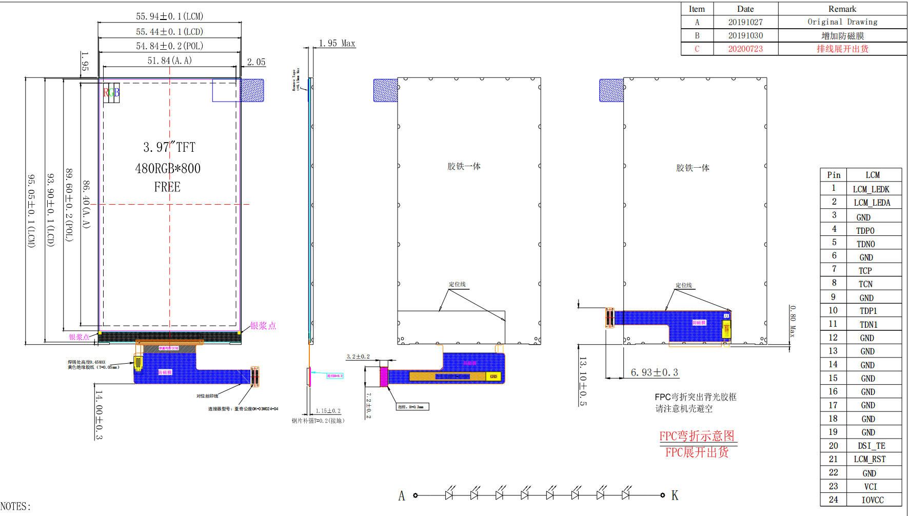 لوحة عرض LCD TFT مقاس ٣٫٩٧ بوصة (١٠٫١ سم) بدقة ٤٨٠×٨٠٠ بكسل، ألوان كاملة، دقة عالية، واجهة MIPI، دائرة تشغيل مدمجة (Driver IC) طراز ST7701S