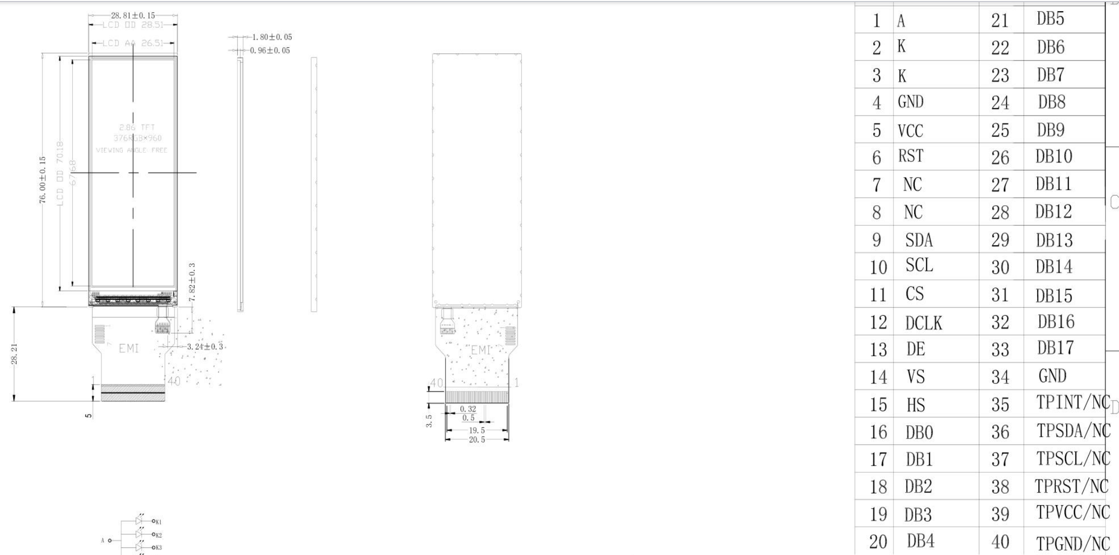 Abmessungen des LCM-Gehäuses: 28,81 (H) × 76 (V) mm