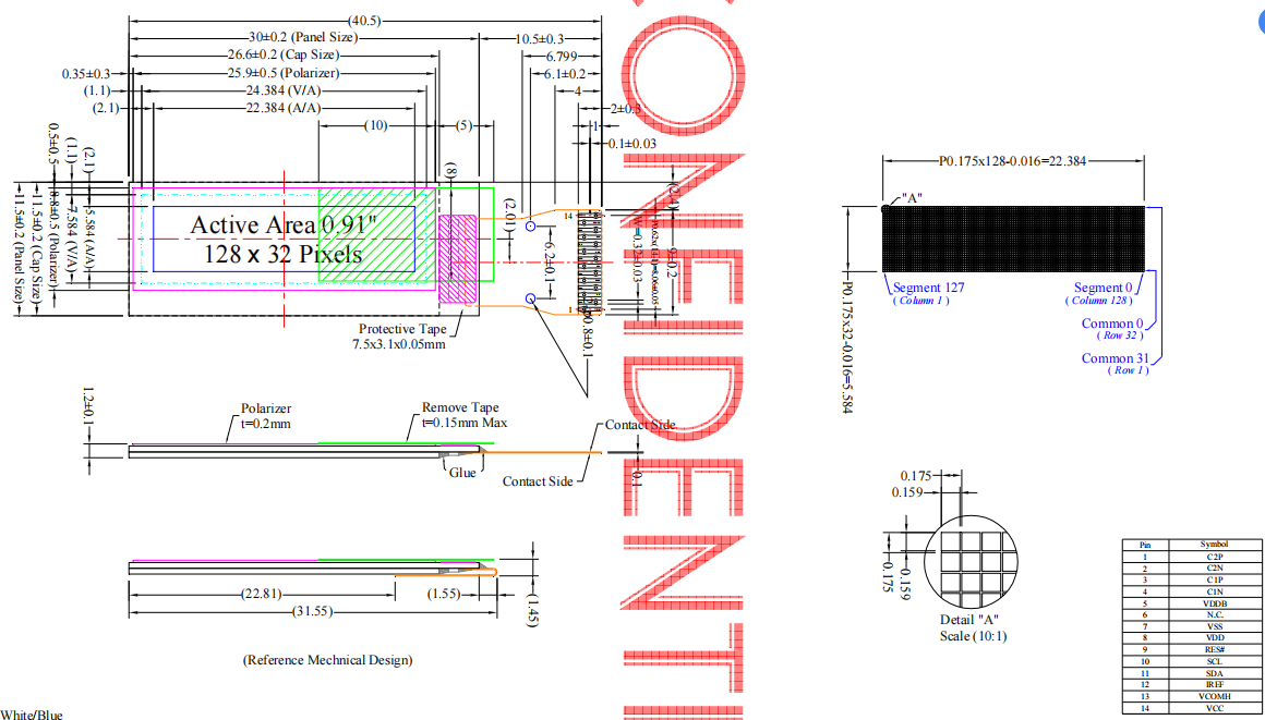 Pantalla OLED I²C de 0,91 pulgadas (0,91'') con resolución de 128 × 32 y 14 pines SPI, controlador SSD1306