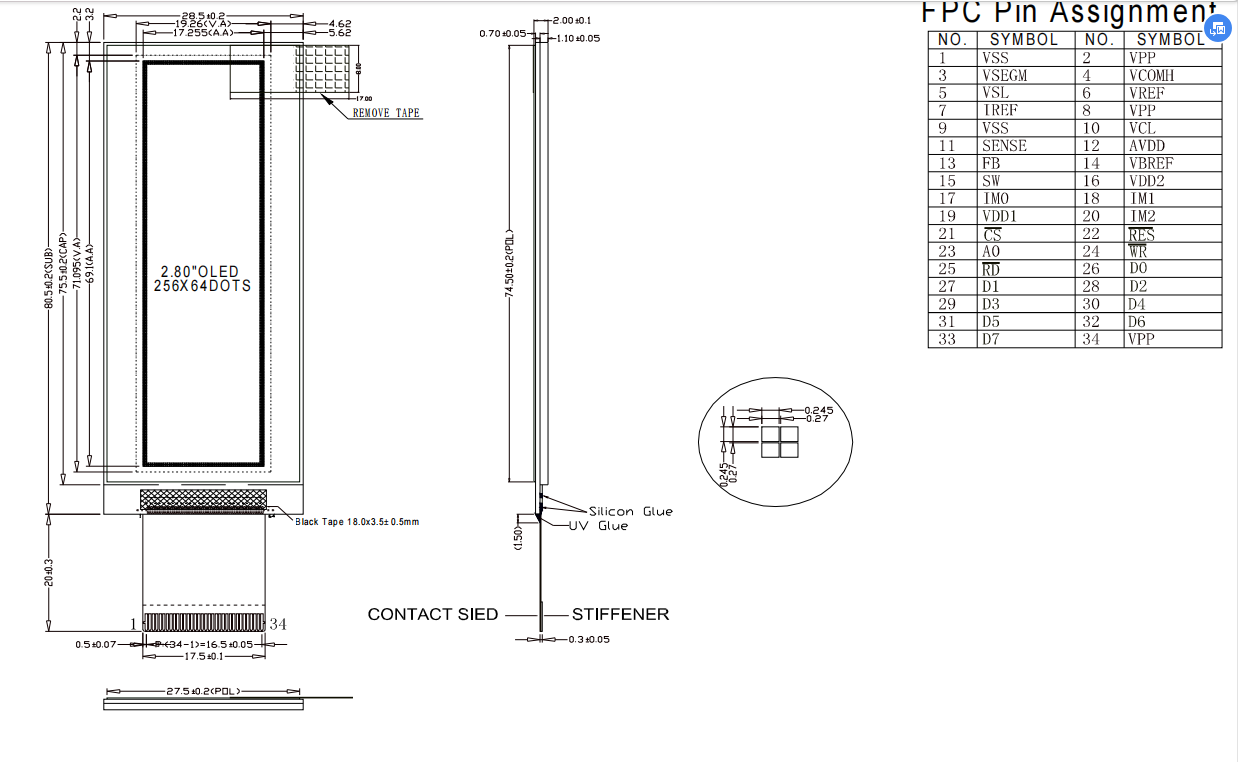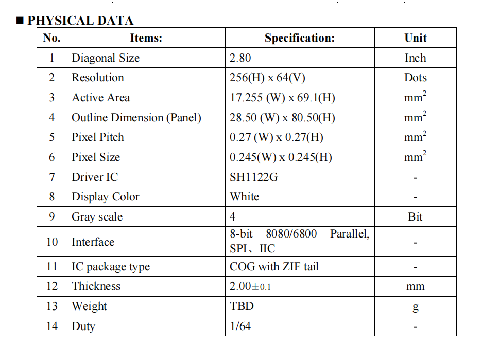 Vertical 2.8'' 2.8 pulgadas 2.8 pulgadas Resolución 64x256 UG-5664ASWDG01 Color blanco SH1122G