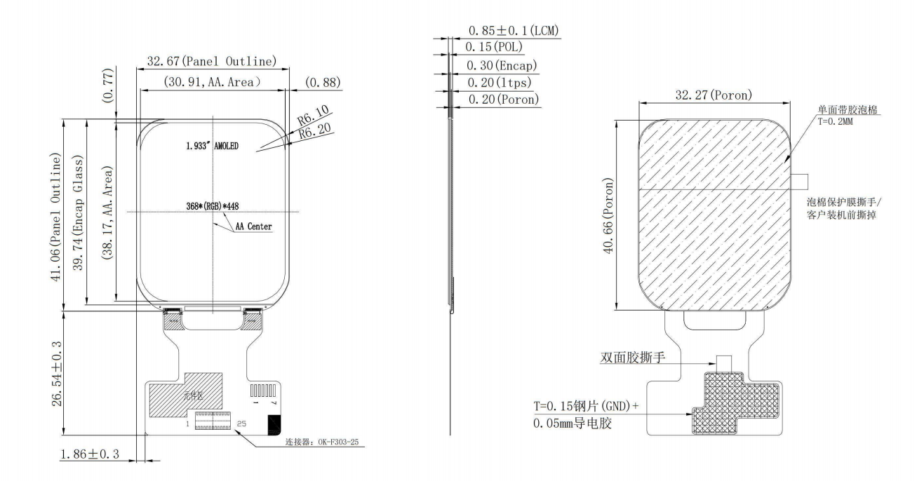 Schema del modulo: 32,672(H) × 41,0596(V) × 0,85(T)