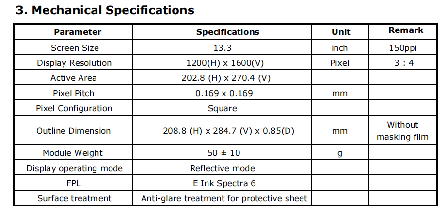 小売用サイネージおよびデジタルフォトフレーム用 13.3インチ 1200x1600 スペクトラ6色Eインクディスプレイ