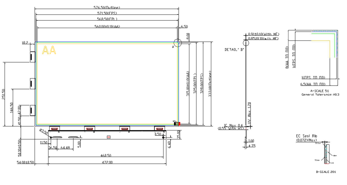 外形寸法: 576.5(W) × 333.0(H) × 0.85(D) mm(マスキングフィルムなし)